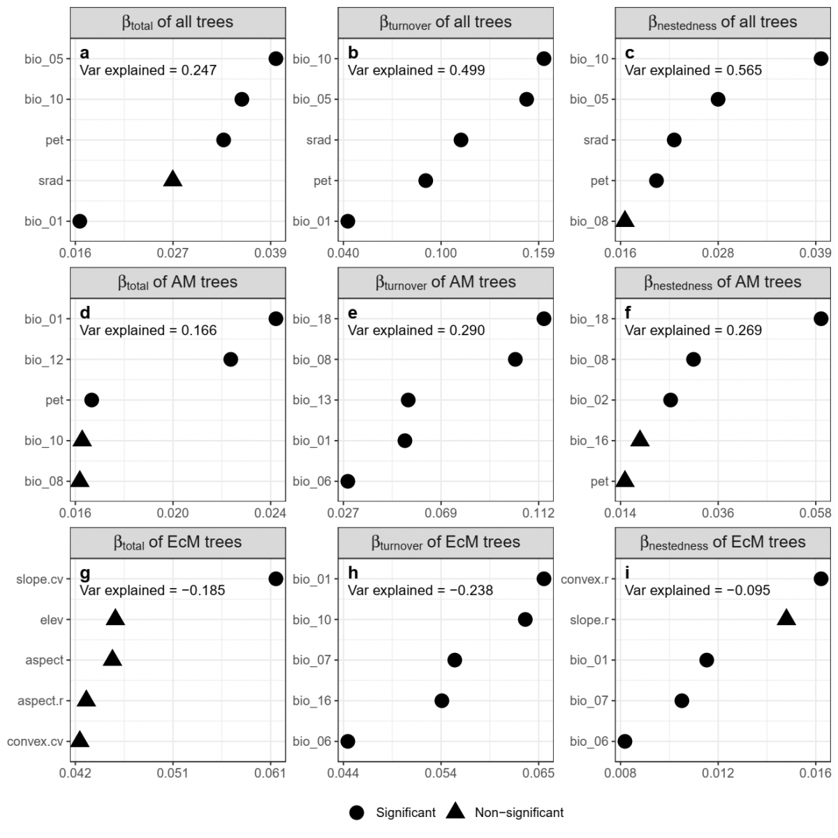 储诚进教授团队收集了全球范围内45个森林大样地(主要来自ForestGEO和CForBio)共3840种、2804270株树木的调查数据。在此基础上,把所有树木划分为丛枝菌根树种(Arbuscular mycorrhizal trees,AM trees)、外生菌根树种(Ectomycorrhizal trees,EcM trees)以及其他树种,计算树木的β多样性及其组分,通过随机抽样的方式排除取样效应的影响,通过β回归、方差分解以及随机森林等手段探讨了不同类型的菌根树种如何影响全球树木β多样性纬度格局以及环境因子如何产生作用。结果发现,丛枝菌根树种的β多样性纬度格局与所有树木的β多样性纬度格局高度一致,而外生菌根树种的β多样性纬度格局不显著或偏离所有树木的β多样性纬度格局较多,表明树木β多样性的纬度格局主要由丛枝菌根树种决定,外生菌根树种影响微弱(图1)。环境因素对树木β多样性的影响主要是通过影响丛枝菌根树种来产生的(图2)。