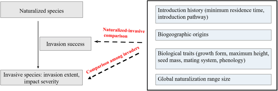 生物入侵对自然生态系统和人类经济生产都造成了巨大的影响,什么样的外来种会转变为入侵种并造成严重危害?鉴于影响外来植物入侵性有诸多可能因素,例如植物的功能性状、起源地、以及引入历史等(图1),比较具有不同程度入侵性的外来物种之间的区别,是探究这个问题的一个有效的方法。传统的大尺度入侵性研究往往只比较外来归化非入侵种(已经在引入地定殖但没有扩散的外来种)和入侵种(已经在引入地定殖并扩散、造成危害的外来物种)之间的区别,但忽视了入侵种之间也会有入侵性的区别:有的入侵种扩散到广大的区域并对入侵的生态系统造成严重危害(例如互花米草),但有的入侵种扩散范围较小,并对入侵的生态系统影响不大。入侵成功(invasion success, 外来归化种成功转为入侵种)的影响因素是否同于入侵种入侵危害程度的影响因素 (图1)?
