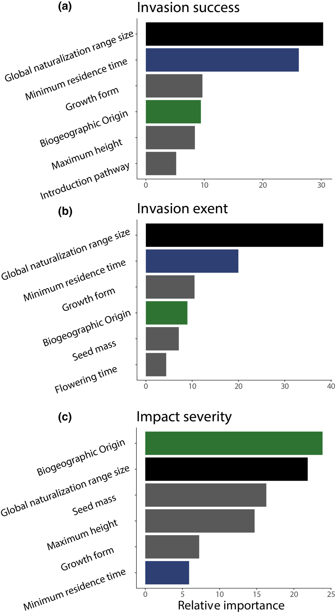 储诚进教授团队首先使用Boosted regression tree(BRT,一种机器学习的回归方法)比较了中国272种外来归化植物与266种入侵植物的区别。研究发现影响入侵成功四个最重要的影响因素为外来种的全球归化范围大小、最小定殖时间、生活型、以及起源地(图2a)。具体来说,全球归化范围越大的外来种越容易转为入侵种,与此同时拥有更短的引入时间(更大的最小定殖时间),更短的生活史周期(一年或两年生草本),以及起源于北美和非洲的外来种更容易从引入地扩散转为入侵种。