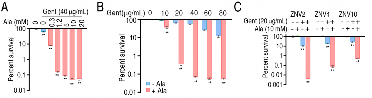 图1. 丙氨酸协同庆大霉素的杀菌效率