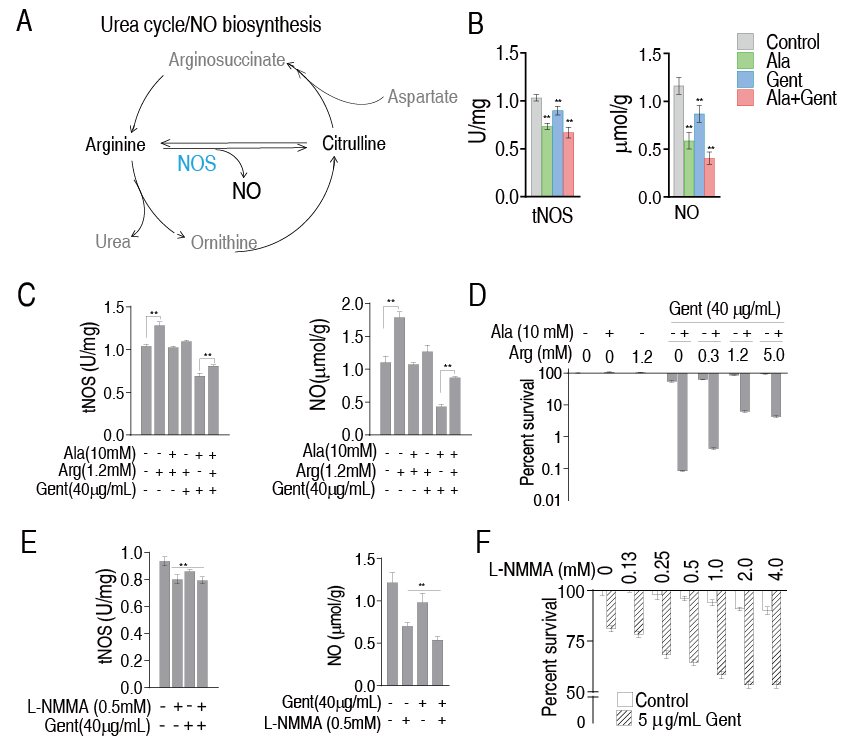 (3)与细菌耐药相关的一氧化氮是由一氧化氮合酶催化精氨酸产生的(图3A)。循此思路,作者发现庆大霉素、丙氨酸和丙氨酸+庆大霉素均可导致总一氧化氮合酶(tNOS)活性和NO水平降低(图3B)。那么,一氧化氮的降低是否成为丙氨酸协同庆大霉素杀菌的关键机制呢?添加NOS启动子L-精氨酸,发现其使得NOS活性和NO水平升高(图3D)的同时,也抑制了抗生素的杀伤作用(图3E)。相反地,外源添加抑制剂NG-单甲基-L-精氨酸,则导致NOS活性和NO水平降低(图3F),从而促进抗生素的杀伤作用。