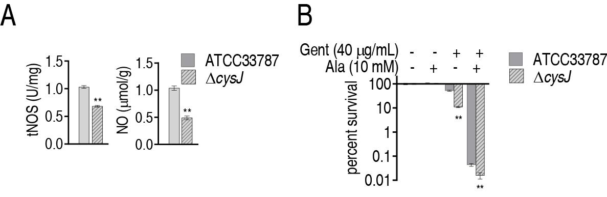 (4)经比对分析,发现ATCC33787中CysJ为一氧化氮合酶同源蛋白。将cysJ基因敲除后,与野生株相比,△cysJ的tNOS酶活和NO含量下降(图4A),并且对抗生素更为敏感(图4B)。这表明 CysJ 在 ATCC33787的内源性NO生成中起作用。