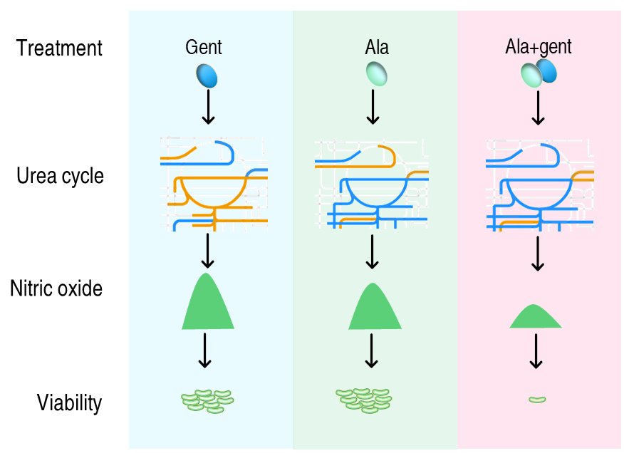其机制可总结为:庆大霉素、丙氨酸和丙氨酸+庆大霉素均导致尿素循环代谢和NO水平降低,从而达到协同使用庆大霉素和丙氨酸的杀菌效率增强作用(图5)。