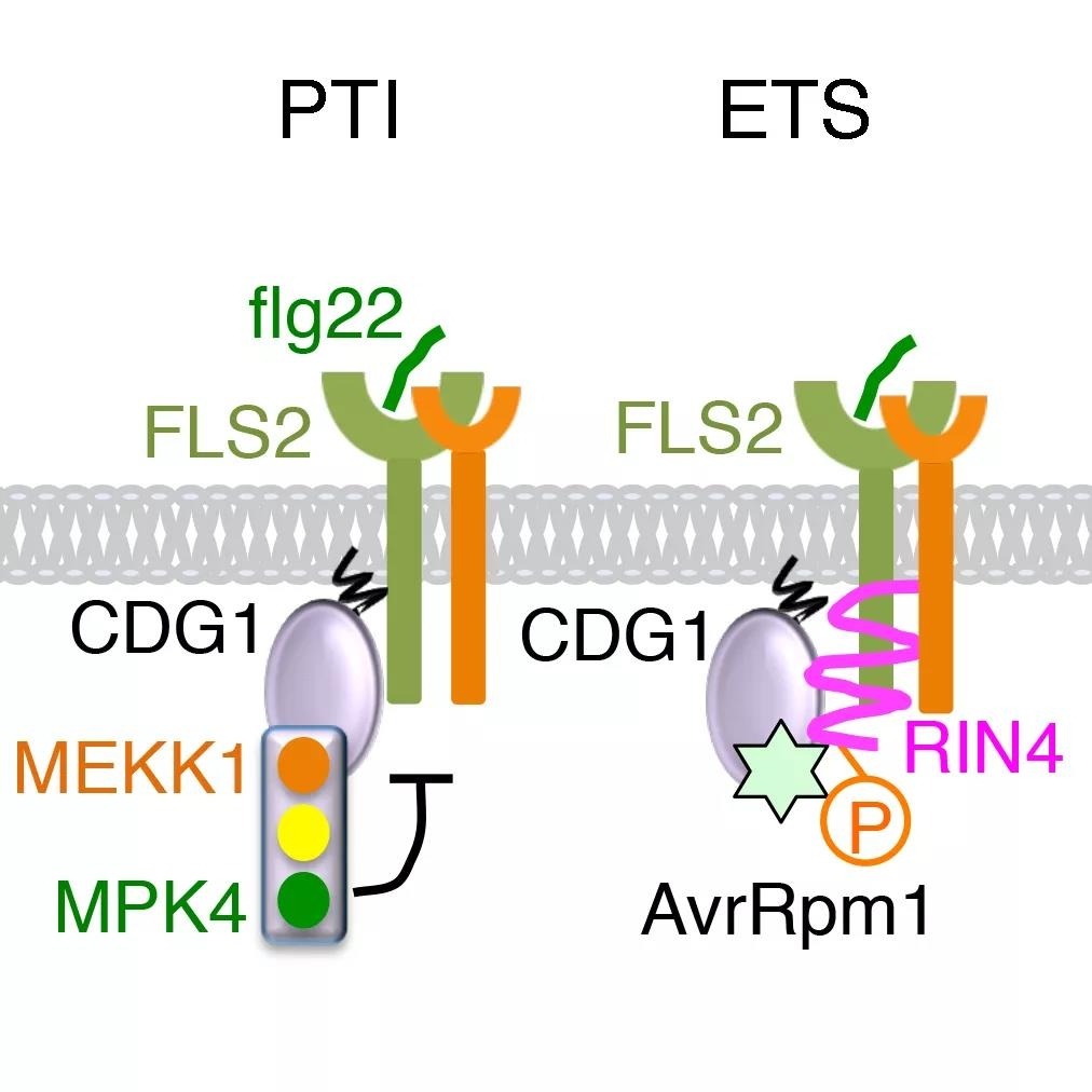 拟南芥PTI的负调控因子RIN4可结合FLS2并抑制其激活,以防止FLS2在未识别flg22的情况下激活免疫;FLS2对flg22的识别能导致RIN4的Ser141位点发生磷酸化,解除对FLS2的抑制而激活PTI;丁香假单胞菌分泌的致病因子AvrRpm1能够操纵未知的拟南芥激酶,磷酸化RIN4的Thr166位点,从而抑制flg22诱导的Ser141磷酸化,使RIN4保持对FLS2的抑制而造成ETS;拟南芥进而通过R蛋白RPM1识别RIN4的Thr166磷酸化,激活ETI。然而,AvrRpm1究竟利用了什么宿主激酶使RIN4的Thr166位点发生磷酸化一直有待阐明。