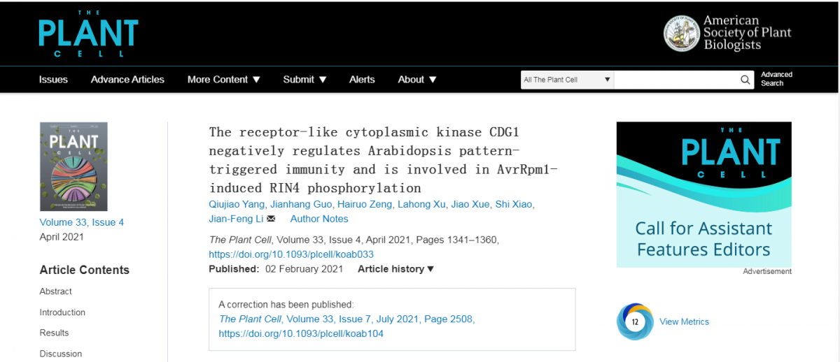2021年2月2日,中山大学李剑峰课题组在The Plant Cell发表了题为The receptor-like cytoplasmic kinase CDG1 negatively regulates Arabidopsis pattern-triggered immunity and is involved in AvrRpm1-induced RIN4 Phosphorylation的研究论文,揭示了拟南芥类受体胞质激酶CDG1是PTI的负调控因子,而AvrRpm1能够诱导CDG1磷酸化RIN4的Thr166位点,造成植物的ETS。中山大学博士生杨秋姣为论文的第一作者,李剑峰教授为唯一通讯作者。该研究得到国家自然科学基金委面上项目的资助。