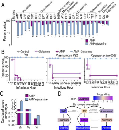 图1. A.谷氨酰胺提高细菌对多种抗生素的敏感性;B.谷氨酰胺提高小鼠对多种细菌感染的存活率;C.细菌药代动力学总结 D. 谷氨酰胺调节嘌呤代谢