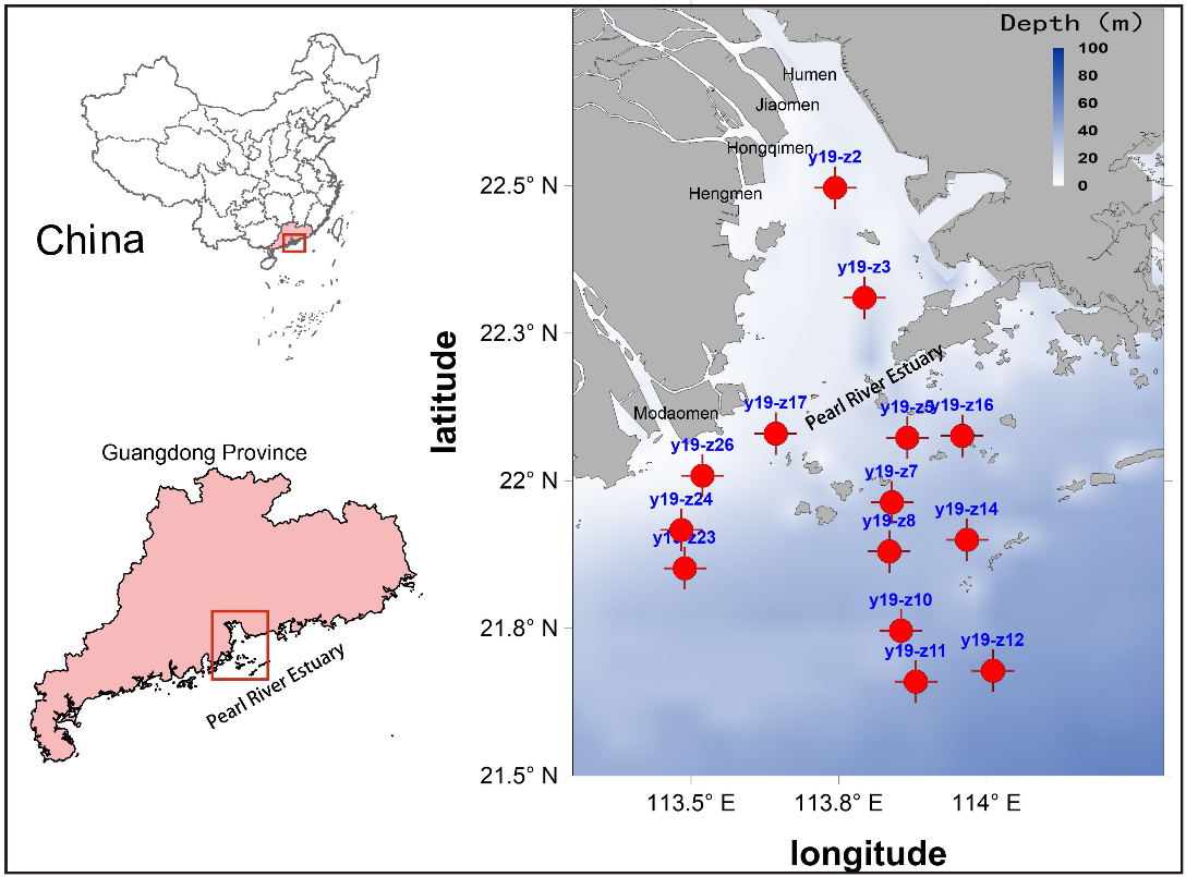 河口是陆源有机碳(TerrOC)转化和埋藏的关键区域之一,在全球碳循环中发挥着重要作用。虽然在河口区域TerrOC的转化和降解主要是由微生物驱动的,但其具体参与的微生物类群和降解过程仍基本未知。木质素作为标志物已被广泛用于研究TerrOC在河口和海洋环境中的输入、迁移和埋藏过程。木质素是最丰富的TerrOC之一,来源于陆生和近岸维管植物的细胞壁。木质素在从河流到海洋的运输过程中,近55%的木质素通过破坏酚类结构而降解。异养微生物的代谢被证明是自然环境中木质素降解的主要途径,主要经过两个步骤:(1)木质素大分子通过初级降解分解为较小的芳香化合物;(2)次级降解者对生成的芳香化合物进行环裂变。但我们对微生物木质素降解的认识主要来自陆地环境,由于依赖培养的方法的局限性和水生微生物群落的复杂性,我们对微生物驱动的木质素在河口沉积物中的降解仍知之甚少。此研究收集了珠江口(PRE)纵剖面上14个站点的表层沉积物(图1)。