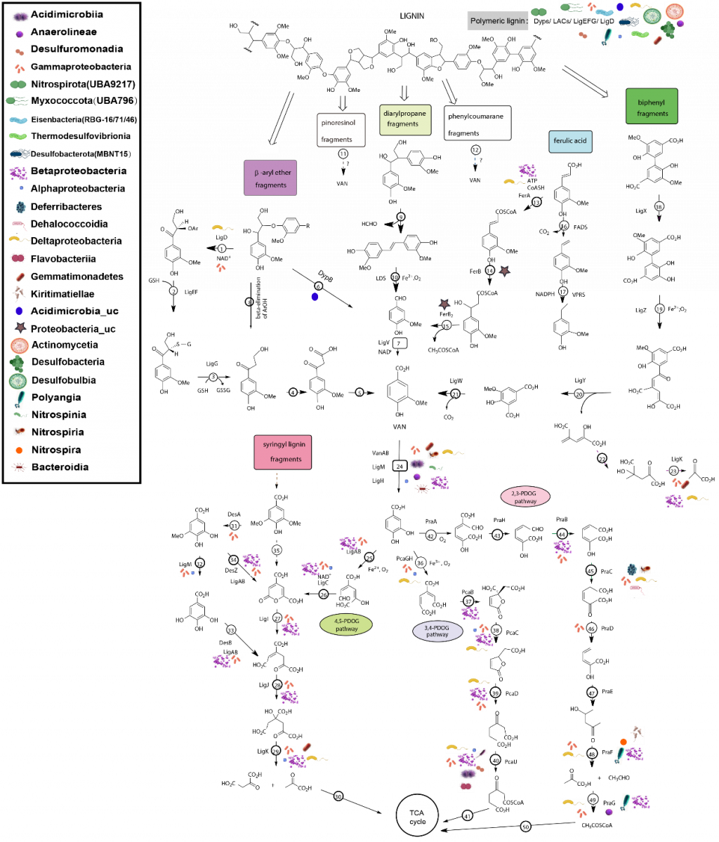 图3 预测PRE中木质素片段的降解途径和降解者(纲水平)