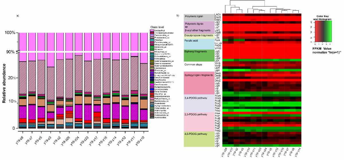 图4 柱状图和热图分析木质素(a)降解者在纲水平上的相对丰度和(b)降解基因的丰度