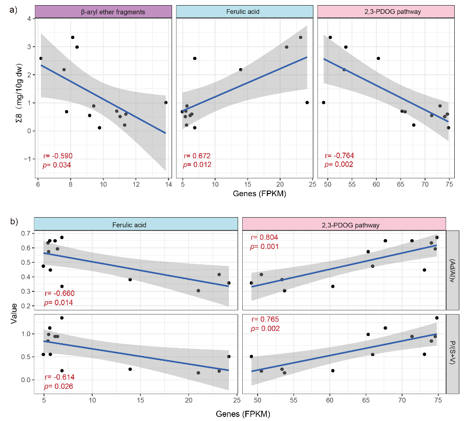 图5 不同途径基因丰度与木质素参数的相关性