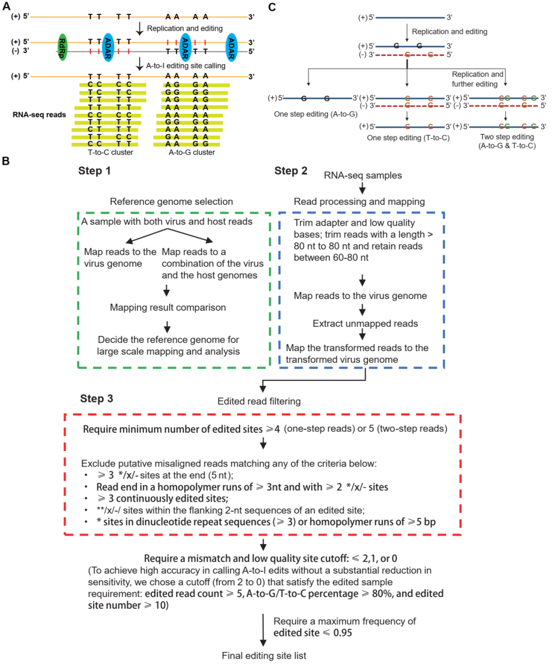 图1. RNA病毒特异性A-to-I RNA编辑位点鉴定流程。(A) SARS-CoV-2基因组中A-to-I RNA编辑位点鉴定示意图;(B) RNA病毒特异性A-to-I RNA编辑位点发现流程;(C) SARS-CoV-2基因组中one-step及two-step RNA编辑现象示意图。
