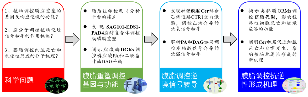 冷害、水涝、病虫害等生物和非生物逆境胁迫是决定植物地理分布、生长发育和产量的主要因素,严重时导致农作物大幅度减产甚至绝收,危害粮食安全。研究表明,植物细胞质膜的脂双层结构作为细胞与外界环境的活性界面,在调控植物逆境响应过程中发挥重要作用。其中,膜脂重塑和脂信号分子产生是植物快速感知逆境因子、形成抗逆性的重要事件。该成果以模式植物拟南芥为研究材料,围绕植物膜脂重塑、脂分子调控逆境信号转导和抗逆性形成三个方面展开研究,揭示了植物调控膜脂重塑的关键基因与功能,解析了脂代谢调控植物逆境信号转导的作用机理,阐明了脂分子调控植物细胞死亡和抗逆性形成的分子机制(图1和2)。这些发现提出了植物维持逆境下膜脂重塑的理论模型,及活性氧ROS是植物逆境应答中联系脂信号与激素信号二级信号分子的学术思想,对于理解植物逆境信号转导机理和重要农作物的抗逆遗传分子改良具有重要的科学意义和理论指导价值。