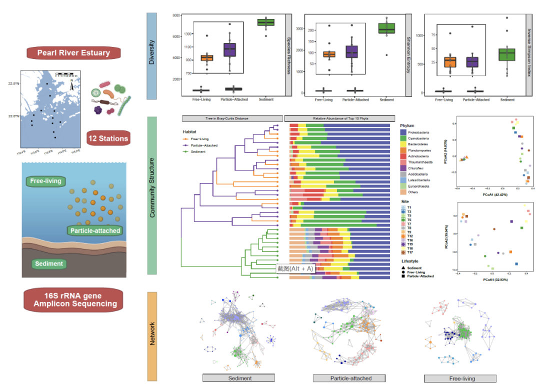 原核微生物是河口生态系统中物质循环和能量流动的重要驱动者。根据原核微生物在河口生态系统中栖息地的不同,其可被分颗粒吸附型 (Particle Attached) 微生物,自由生活型 (Free Living) 微生物和沉积物中的底栖微生物,三种类型的原核微生物可能因其生活环境的差异而具有不同的群落结构、代谢偏好和环境变化的响应特征。明确这些不同对于我们更好的认识河口微生物非常必要。然而,目前还比较缺乏对珠江河口三种生活型微生物的群落结构、环境驱动因子和生态网络特征的系统比较研究。