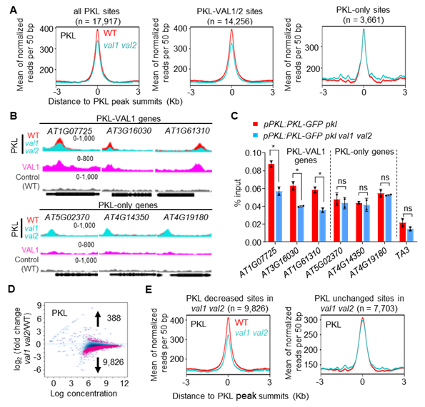 图2. VAL1/2直接招募PKL到它们的共同靶基因