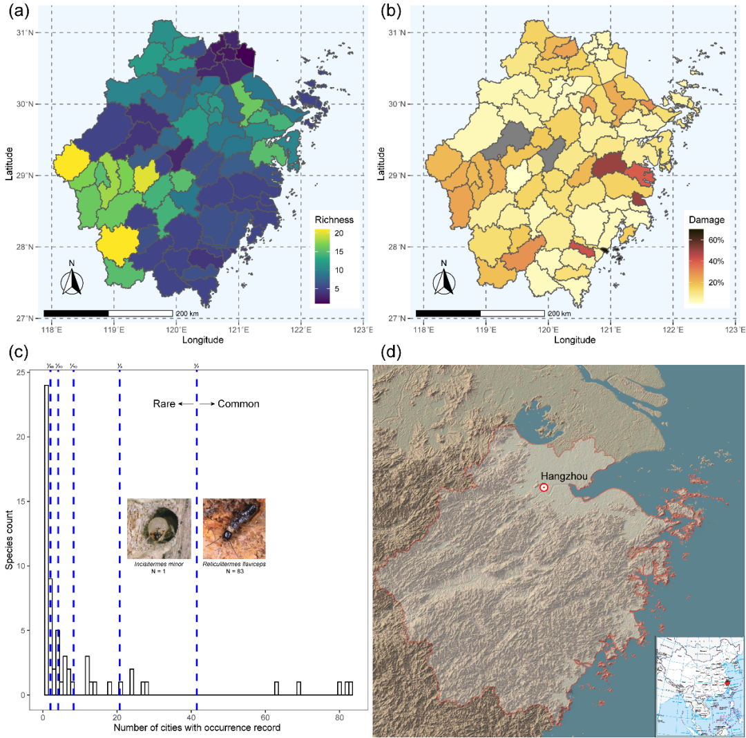 图1 数据总览。(a)各区县白蚁物种丰富度;(b)各区县城区建筑受灾水平;(c)常见和稀有种白蚁按照五个临界值进行区分:50%、25%、10%、5%、2.5%;(d)研究地点浙江省(红线内部)