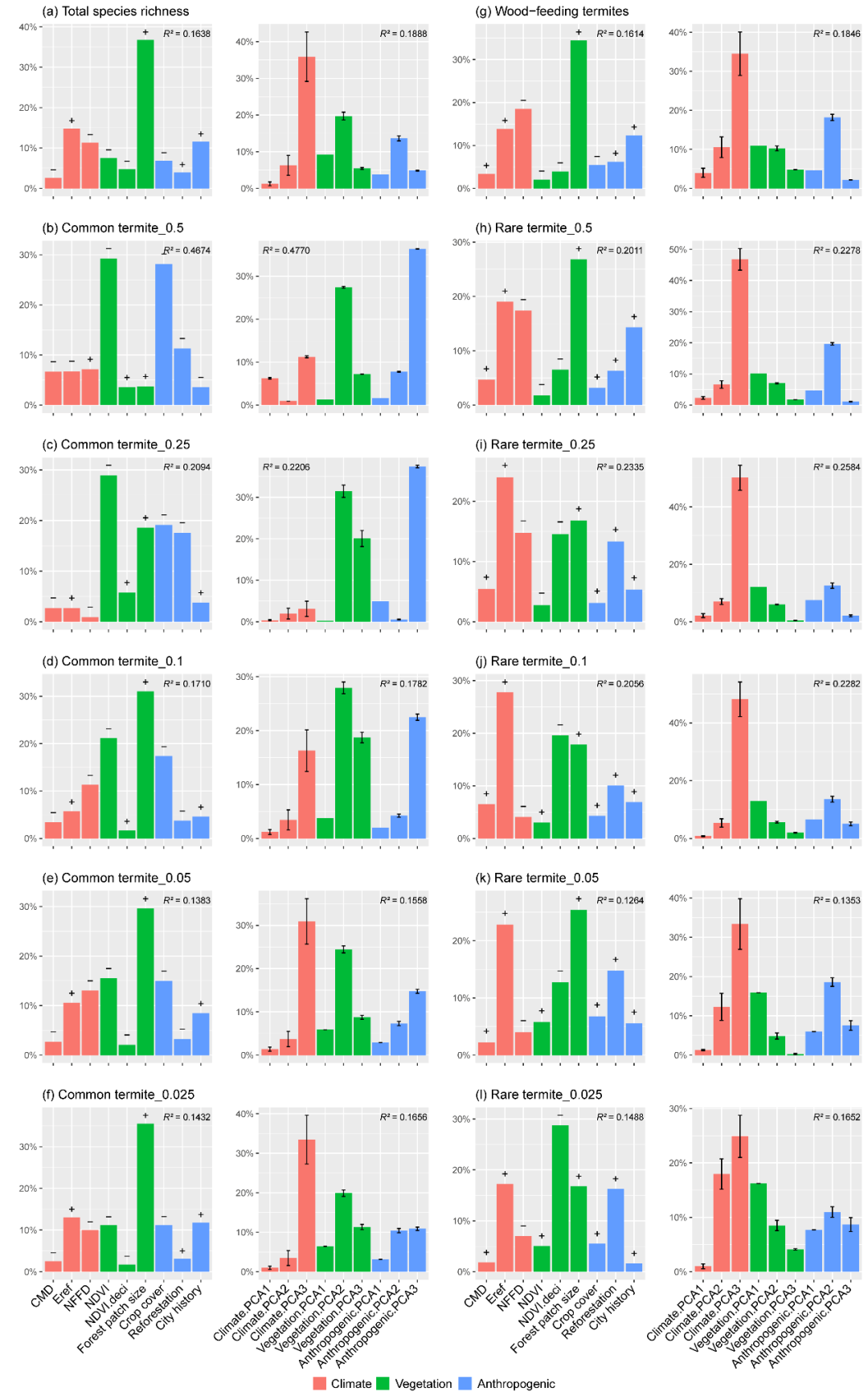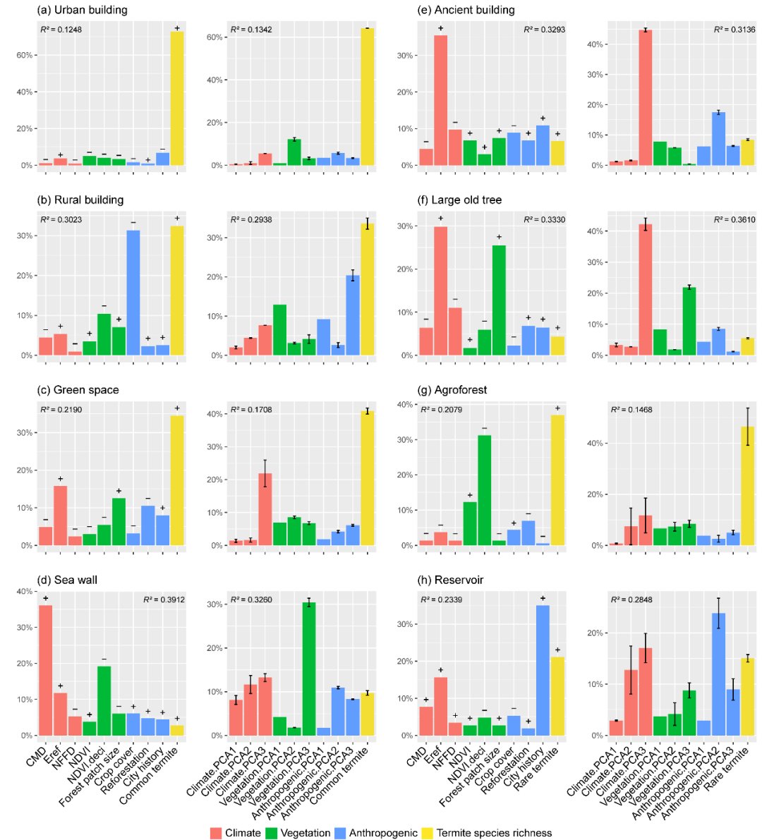 与环境因子相比,常见白蚁物种丰富度对于三类分布于人口密集区域的设施(城区建筑、农村建筑、城市绿地)的受灾水平具有最强的解释度。相较而言,气候对于古建筑和古树两类处于人口较稀少区域的设施受灾水平具有更强的解释度,气候和人为活动对水库受灾水平具有较强的解释度,而稀有白蚁物种丰富度仅对森林受灾水平有最强的解释度(图3)。