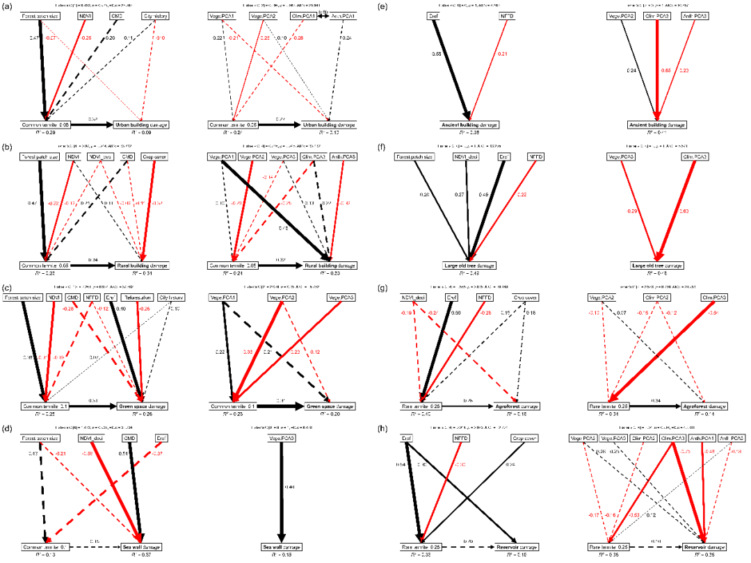进一步分析发现,植被因子主要通过影响常见白蚁物种丰富度,进而间接地影响人口密集区域设施的受灾水平。气候因子则直接作用于人口稀少区域设施的受灾水平(图4)。