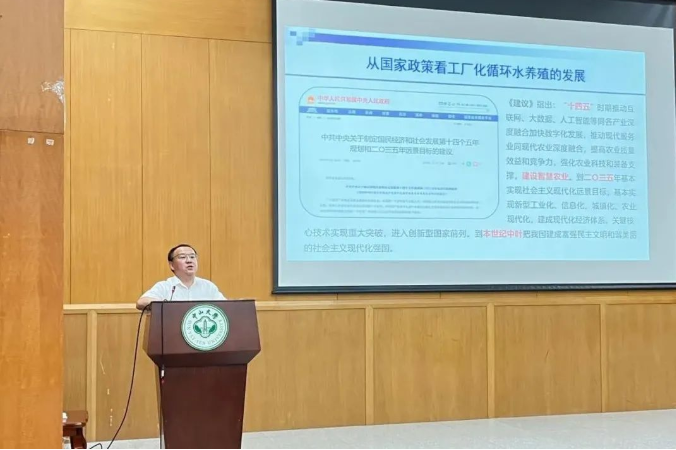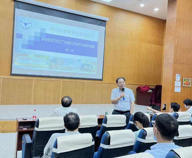 15日下午,刘教授为师生们作了题为“多维视域下工厂化循环水养殖产业发展与展望”的学术报告。学术报告在贺丹青堂进行,由何建国主任主持。