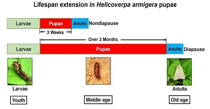昆虫滞育(diapause)类似动物冬眠,是物种为了生存而进化出来的重要策略,因为在寒冷地域不滞育就面临死亡。徐卫华教授团队以农业害虫--棉铃虫(Helicoverpa armigera)的蛹滞育为研究对象开展工作,蛹期相当中年期,蛹滞育和生命延长同义,属于healthspan范畴(图1)。团队的前期工作发现了第一例自然发生的、生理水平的ROS作为胞内信号调节棉铃虫脑中胰岛素信号路径来实现生命延长(2017,PNAS)。在此基础上,团队深入开展了FoxO延长生命的机制研究。