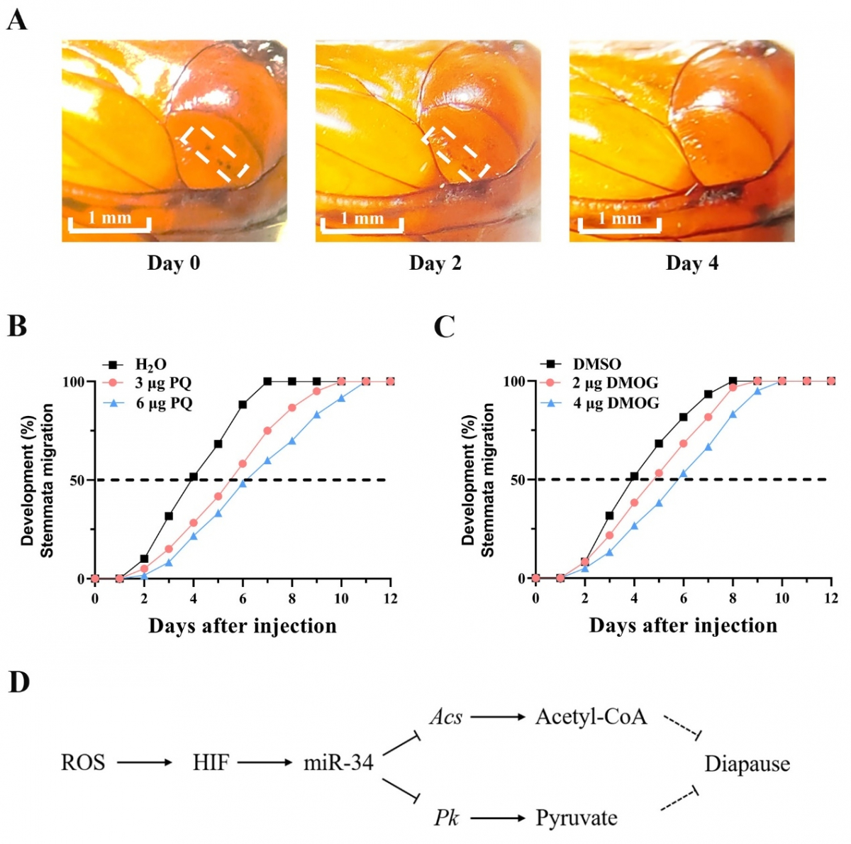 图1. 活性氧(ROS)和低氧诱导因子(HIF)的激活剂都能延长蛹发育时间,进而诱发蛹滞育机制