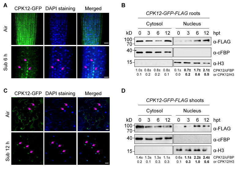 图1. 低氧诱导磷酸化的CPK12由细胞质向细胞核转移