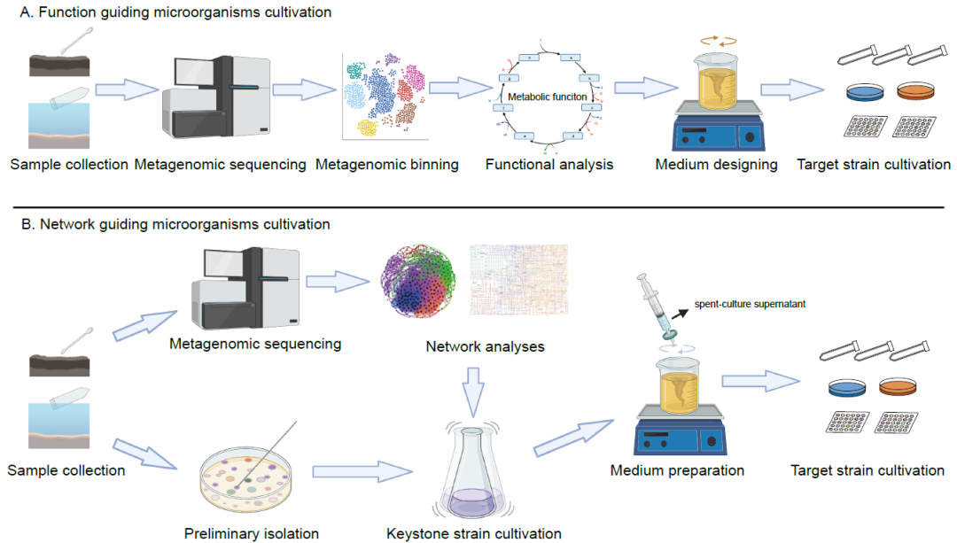 图2. 多组学指导微生物培养方法的两个例子。(A)功能指导微生物培养; (B)网络指导微生物培养。