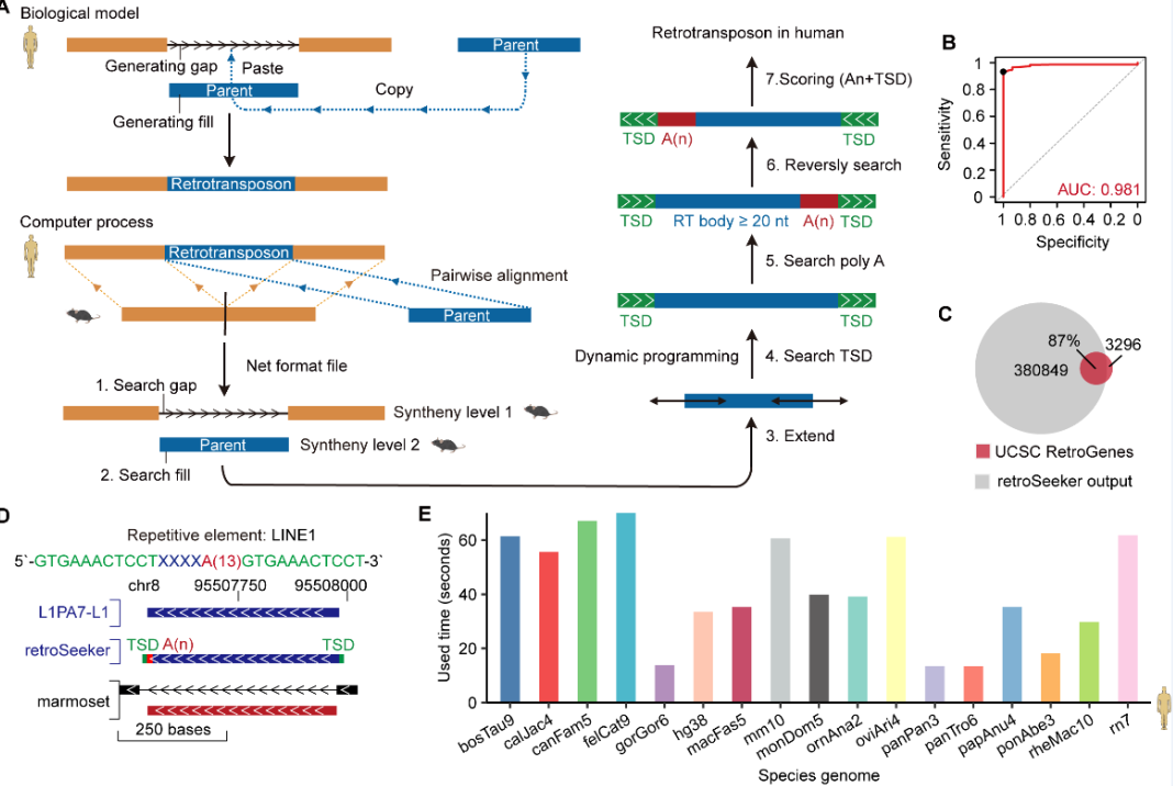 近日,我室杨建华/屈良鹄教授团队开发了在全基因组检测逆转录转座子的新计算方法retroSeeker。通过将逆转录转座子事件的生物学模型(复制-粘贴)映射到比较基因组学数据(gap和fill)中,retroSeeker算法能够准确地识别任何物种基因组中的新逆转录转座子。具体而言,亲本基因的存在产生了一个“填充”(fill)区域,而“复制-粘贴”过程则在新的基因座产生了一个“间隙”(gap)区域,通过将物种间的基因组进行两两比对,可以复现这些“填充”和“间隙”区域以获得候选的转座子区域 (图1A)。此外,根据逆转录转座的TPRT(target-site primed reverse transcription)机制,逆转录转座子的复制往往还需要借助其poly(A) 尾巴,且在插入新基因座后,逆转录转座子两侧还会形成标志性的TSD(target site duplications)序列。因此,一旦retroSeeker确定了潜在的逆转录区域,它会立即利用动态规划算法对侧翼的TSD和poly(A)序列进行搜索和评分,最终获得高置信度的逆转录转座子候选 (图1A)。通过模拟数据和真实数据的测试,retroSeeker算法表现出高度特异性、高灵敏度和快速的运行速度。(图1B-E)。