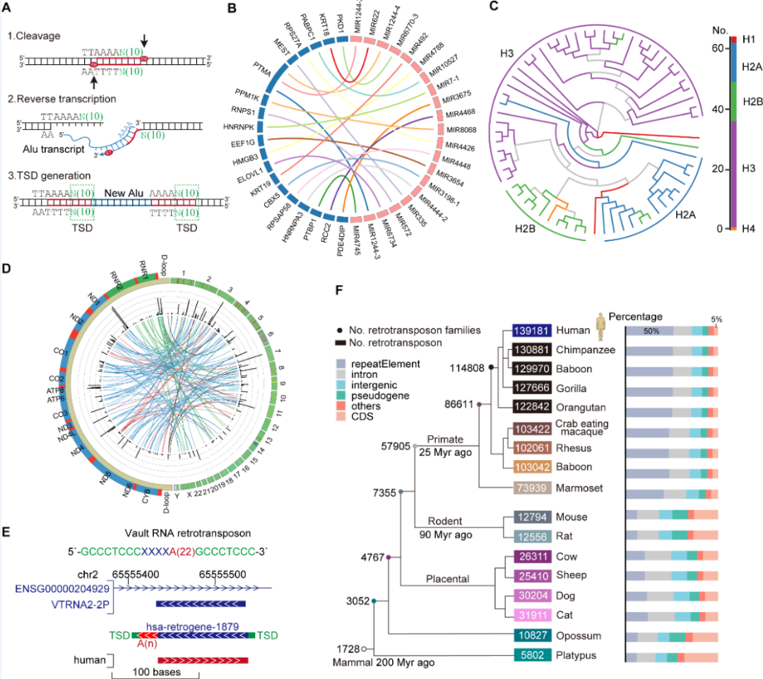 逆转录转座子(Retrotransposons)在大多数物种中都普遍存在,能够通过“复制-粘贴”机制进行大量扩增,在人类基因组中占比超过35%。逆转录转座子可以为创造新的功能基因提供原料,是进化多样性的最主要来源之一。它们能引发现有基因序列的改变,或充当新基因的启动子,影响基因选择性剪接,甚至促使新基因形成。具有表达潜能的逆转录转座子对人体生理、组织分化、癌症的发生发展具有深远的影响,且被认为在哺乳动物大脑进化中扮演重要角色。然而,现有的逆转录转座子检测方法存在局限,需要已知确切序列,然后进行有监督的同源搜索。研究通常仅限于几种经典的LINE/SINE元件,缺乏全面系统的基因组尺度探索。因此,各种类型的逆转录转座子在全基因组的精确分布图谱、生物生成、动态变化、潜在功能和作用机制仍有待阐明。